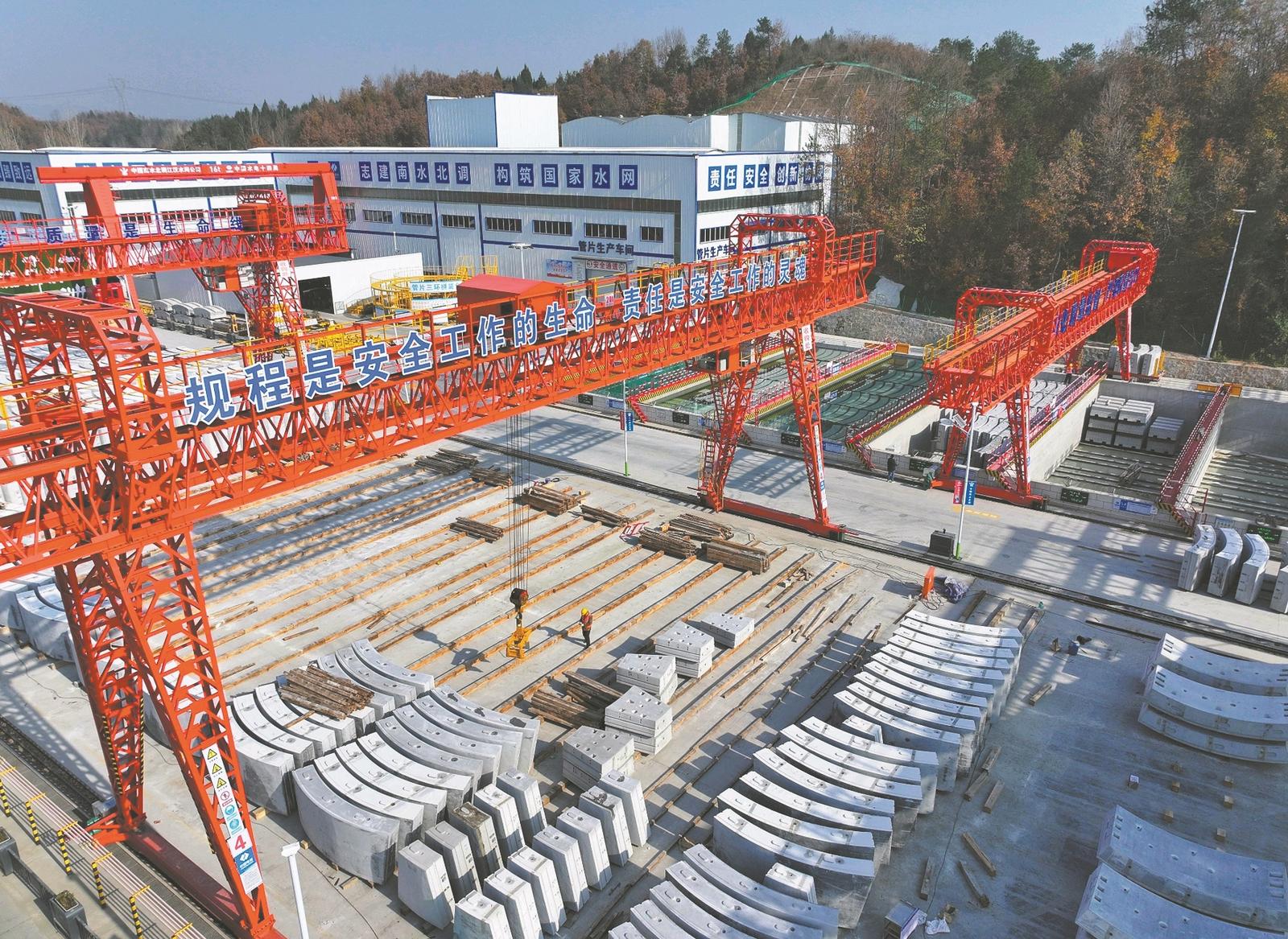 12月3日,在位于谷城县五山镇的引江补汉工程3号预制管片厂,工人们忙着生产管片。