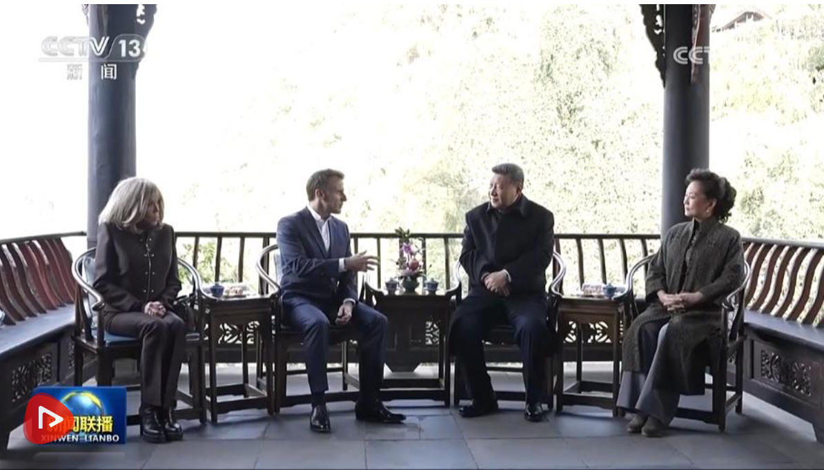 12月5日,国家主席习近平在四川省成都市都江堰同法国总统马克龙进行友好交流。这是两国元首夫妇落座怀古亭,临水品茗,纵论天下。