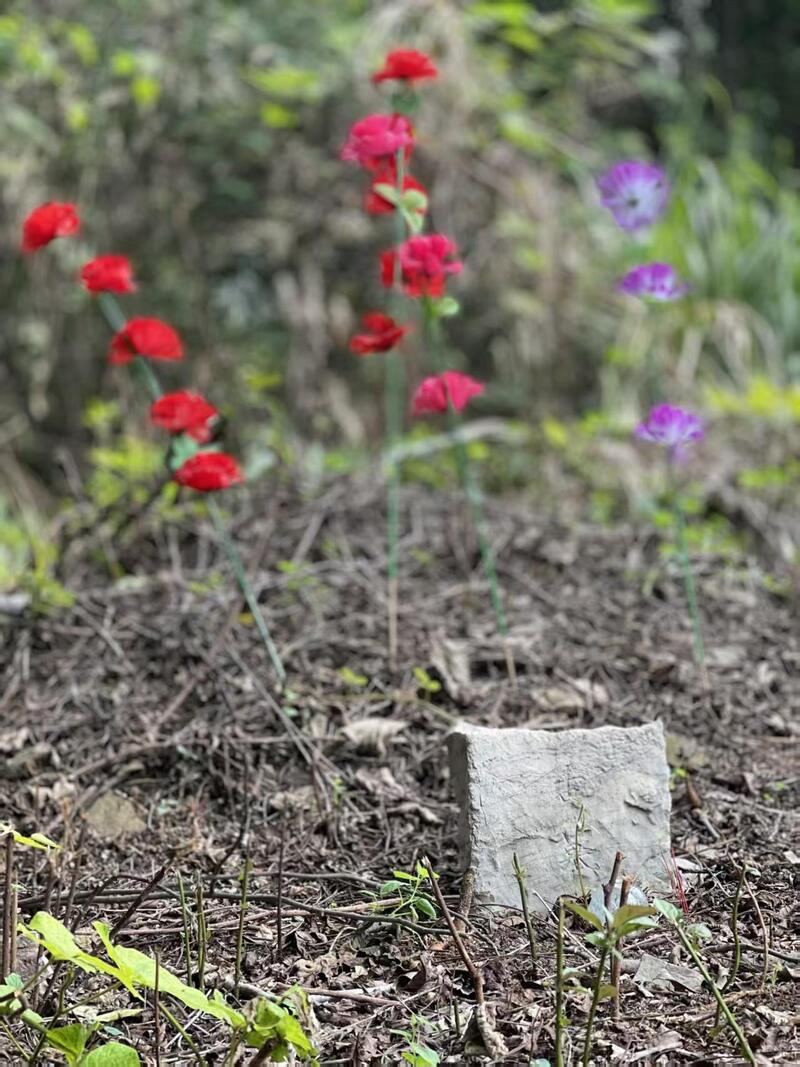 朱子清墓并非孤例。在冯美成指引下,记者一行人转向另一座桂竹山。在密林中跋涉了近30分钟,一个插着四根坟标的小土坡映入眼帘,一方刻着“古墓”二字的简陋石碑旁,摆置着一盏小小的长明灯。