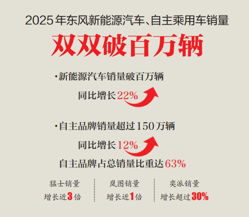 2025年,东风汽车新能源汽车销量高质量跨越100万辆,自主品牌销量突破150万辆,占总销量比重达63%,企业发展结构完成了由“合资主导”向“自主挑大梁”的实质性转变。