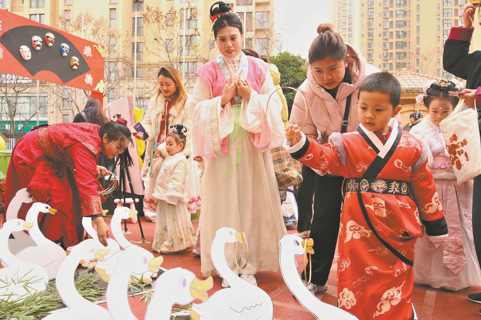 体验投壶、捶丸,身着宋韵服饰的孩童在古风市集间穿梭,与“宋代货郎”亲切互动……12月26日下午,一场以“梦回雅宋·嘉年童韵”为主题的文化庙会在襄州区暻皇幼儿园上演。孩子们在沉浸式体验中,仿佛穿越千年,完成了一场与历史文明的对话。