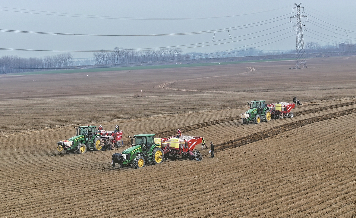 1月10日,在襄城经济技术开发区襄阳绿正农业有限公司万亩马铃薯种植基地,多台大型机械正在播种。