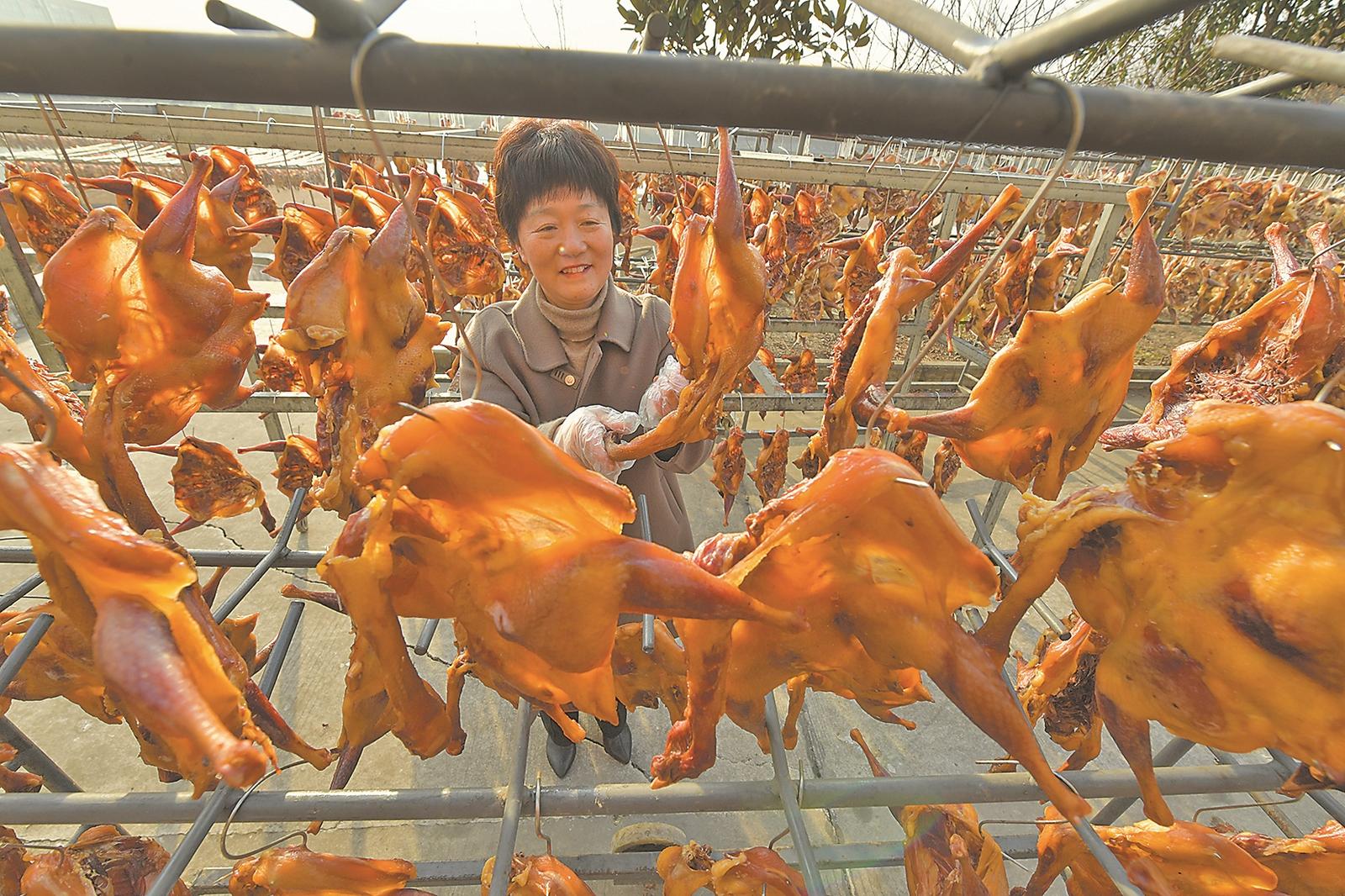 1月9日,在宜城市绿源丰农民专业合作社晾晒场上,一排排金黄油亮的酱香鸡在冬日暖阳下自然风干,负责人何燕正检查腊味品质。她将传统工艺和现代健康理念融合,创新推出“少盐酱香”系列腊味产品,带动周边村民增收致富。