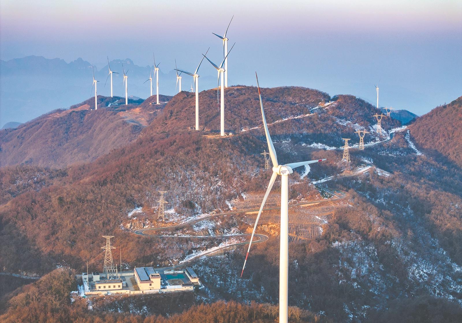 1月17日,在保康县后坪镇横冲风力发电场,一台台风力发电机矗立在群山之巅,迎风旋转,不断输送绿色电能,助力低碳减排。