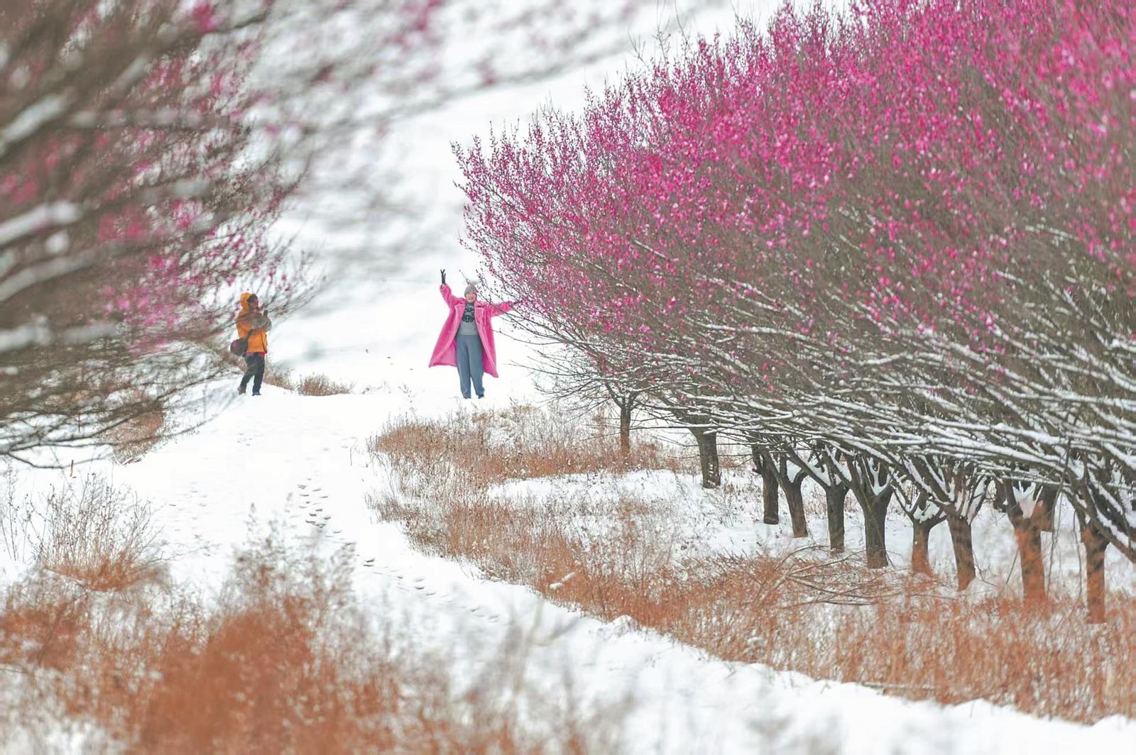 1月21日,在李楼镇鲍河村,连片的红梅顶着大雪肆意盛开,将坡地晕染成一片柔和的粉色,引来周边村民踏雪赏梅。
