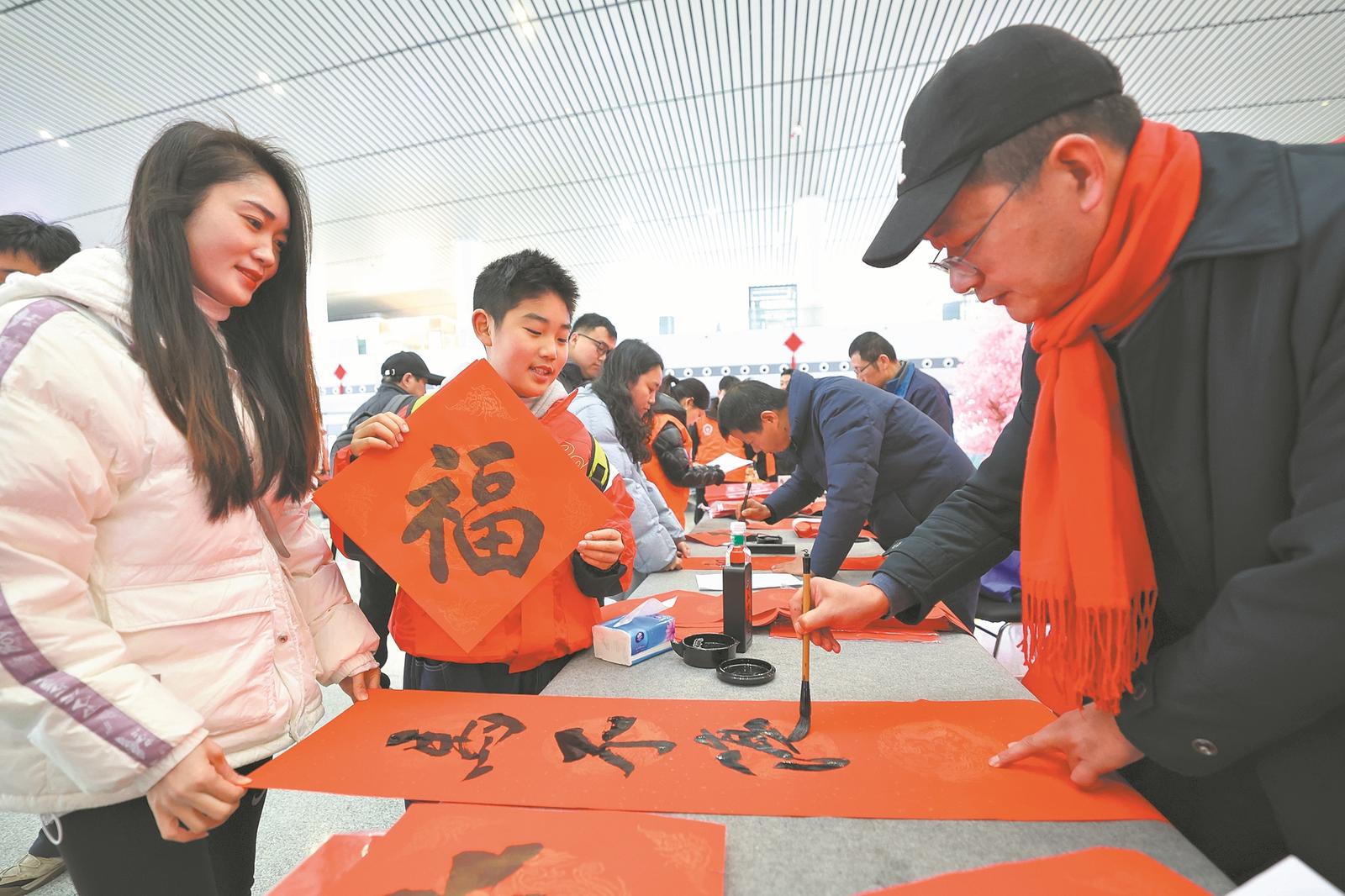 在襄阳东站候车大厅,书法家为旅客写“福”字、对联 全媒体首席记者杨东 通讯员刘娟 摄