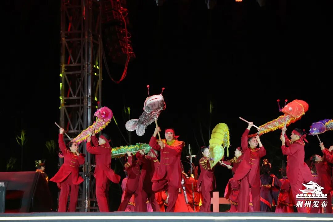 看——《五虾闹鲇》正热闹开场。五只彩虾与鲇鱼灯在楚舞中穿梭游弋,虾寓五福临门,鲇谐“年年有余”。这是水乡荆州捧出的吉祥问候,更是一座千年古城向八方发出的诚挚邀约。