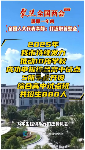 2025年,襄阳市持续发力推动10所学校成功申报综合高中试点,5所学校开设综合高中试点班,共招生880人。