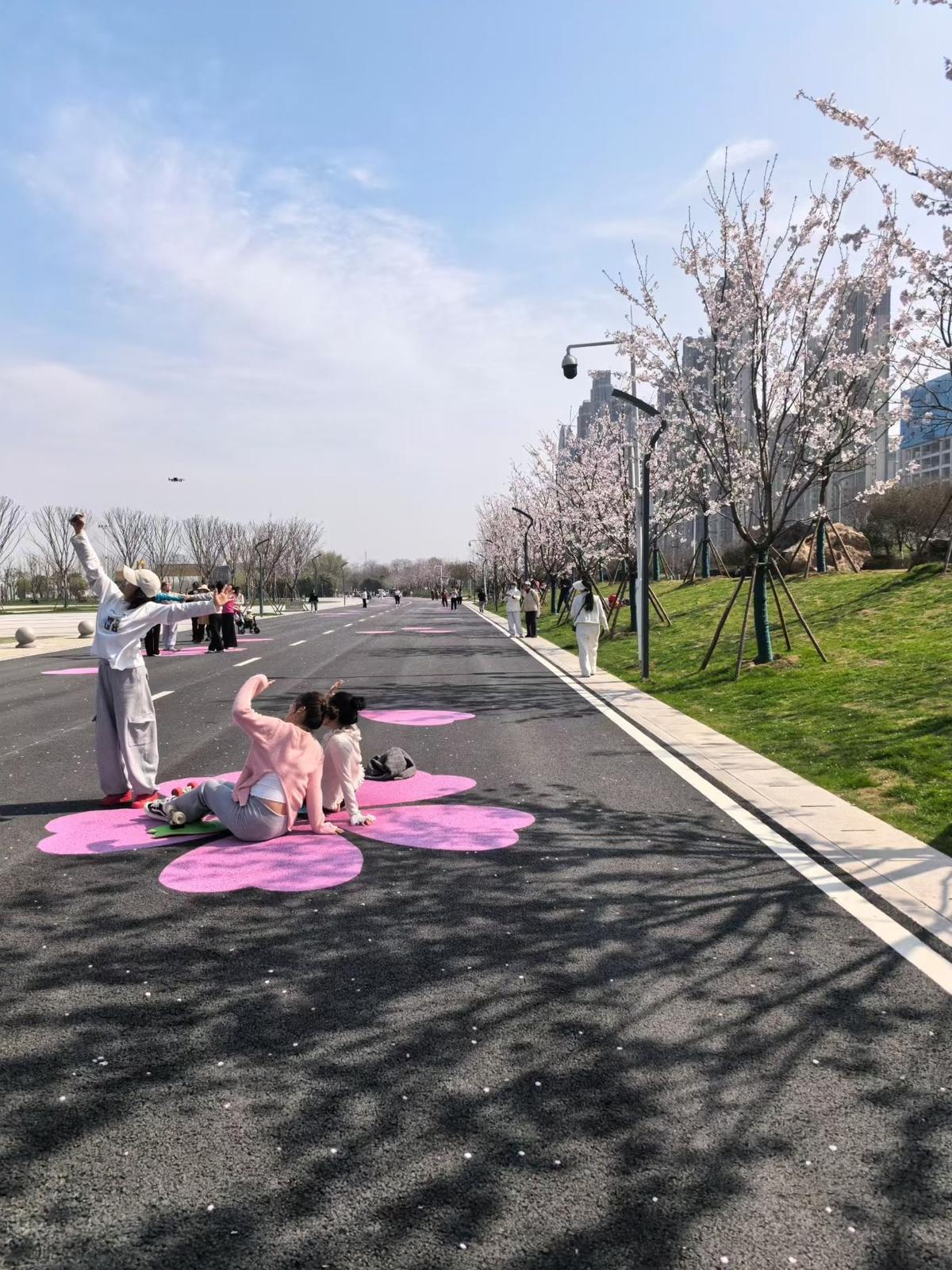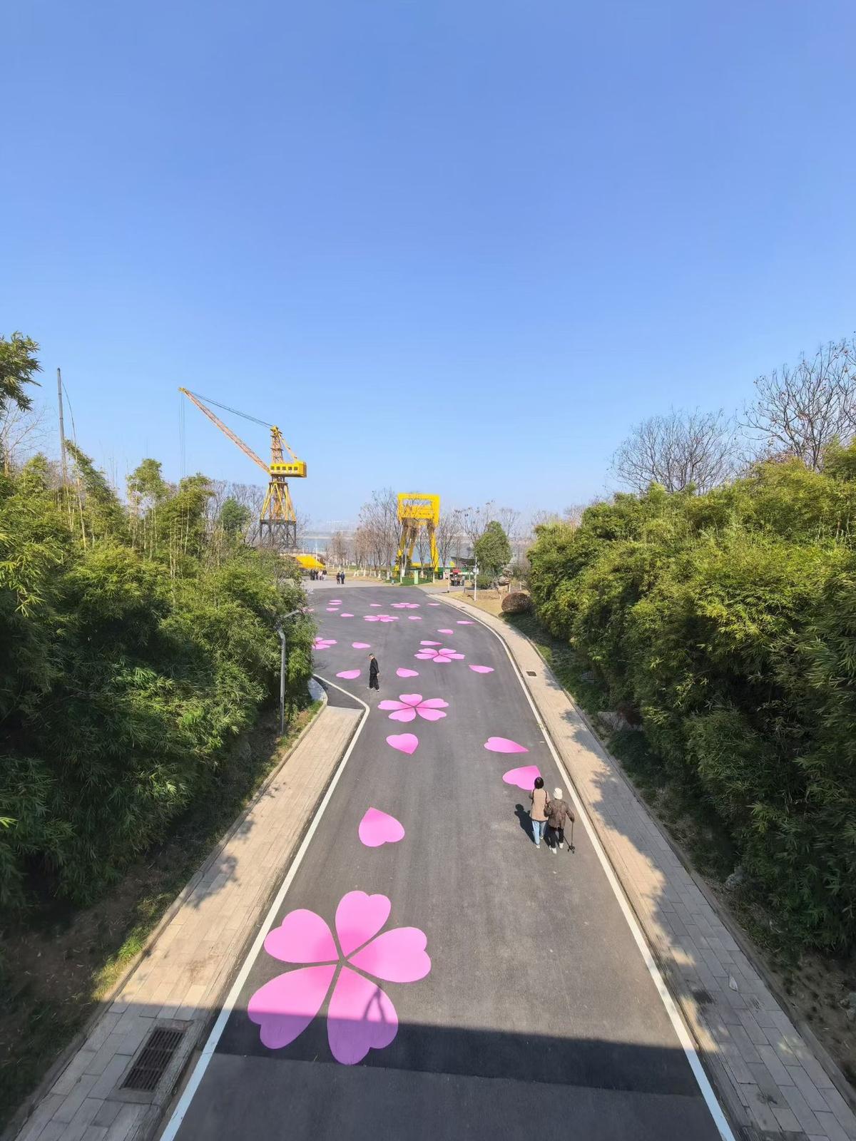 在建设三路闸口,春樱气息扑面而来,十来株樱花树开得正盛。走进终点区域,原本黑色的沥青赛道,化作一条长达760米的绝美“樱花跑道”。路面以艺术手法绘有78组灵动飘逸的樱花与花瓣图案,奔跑其上,如畅游花雨之中,这是今年汉马的独特设计。沿途,60余株真实的樱花树组成樱花长廊,部分已绚烂绽放,与远处工业遗存的大塔吊同框,形成刚柔并济的独特美感。“变化太大了,真漂亮!”3月13日上午,家住附近的万先生特意来“探班”,他举着手机拍个不停,“氛围十足!到时候选手跑过终点线,仪式感拉满!”在他的镜头下,有市民坐在大朵樱花图案上拍照,有市民正在樱花树下漫步。