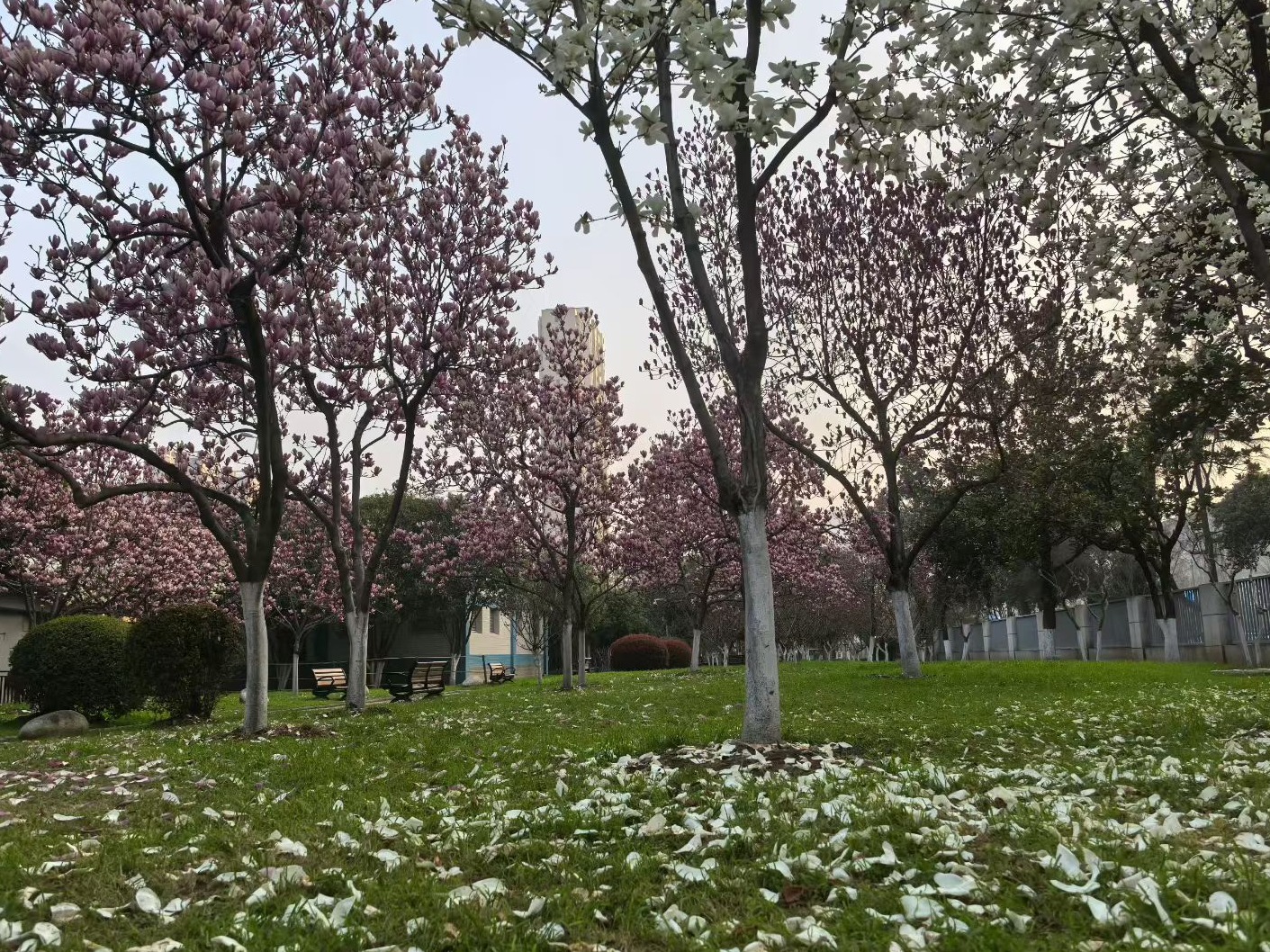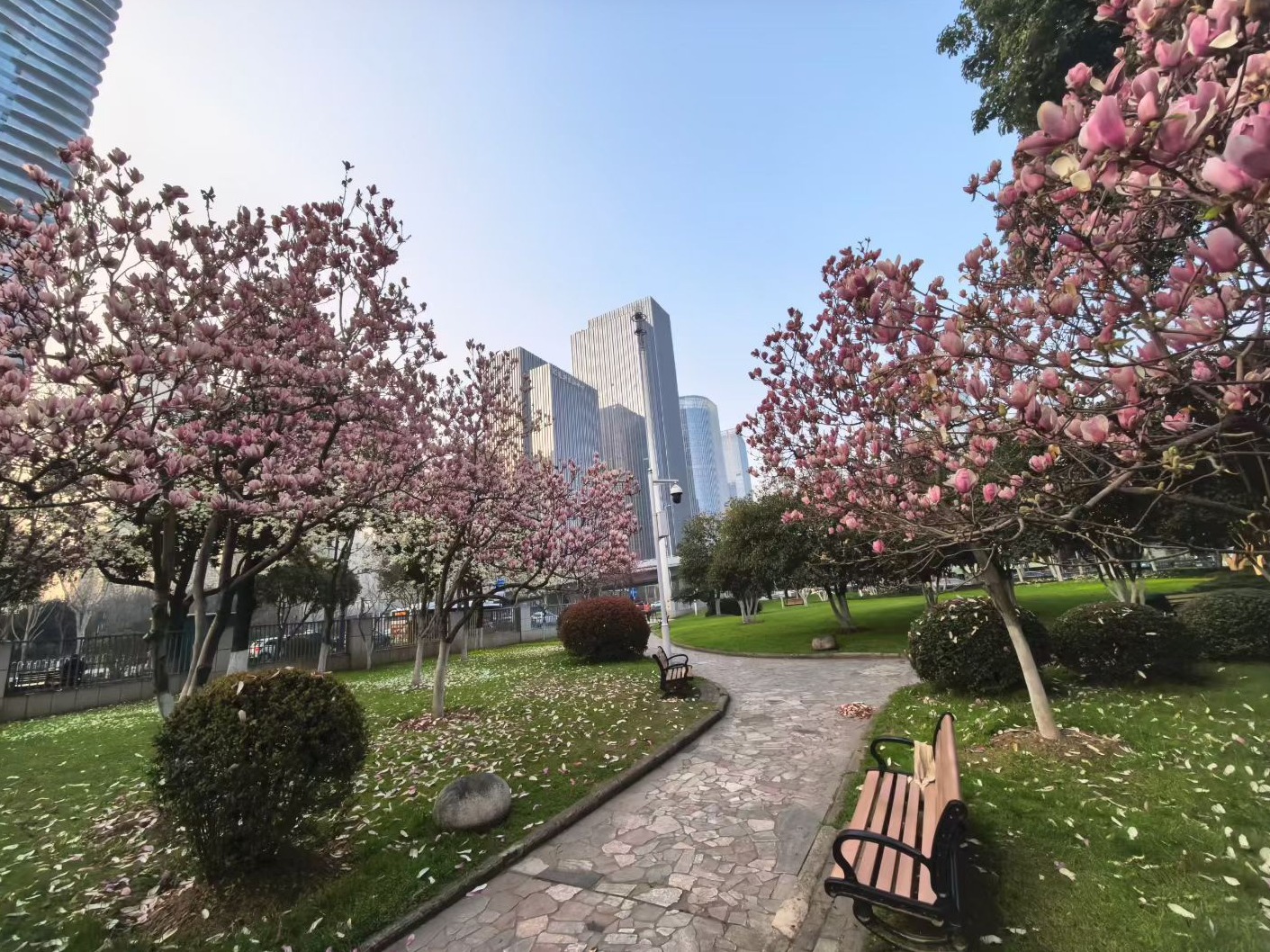 离开主干道的喧嚣,记者拐进沙湖片区,周遭瞬间安静下来。沙湖公园像是城市中心的“绿肺”,环湖绿道上,跑步的人三三两两,几只水鸟掠过湖面,划开一道涟漪。市民秦先生最近两天清早都在公园内散步,“玉兰和杏花这几天正好,但大家最惦记的还是樱花。再过一周左右,1000多株樱花即将盛放,亲水平台那边最集中。樱花映着湖水、绿树,特别好看。”