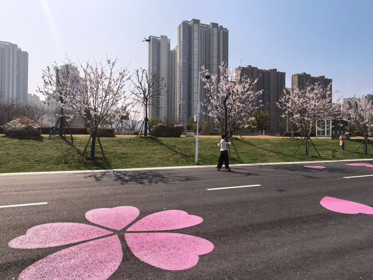 另一处宝藏是东湖路旁的白鹭街。街道两侧宽阔的绿化带内遍植樱花,形成一条精致的樱花廊道,闹中取静。