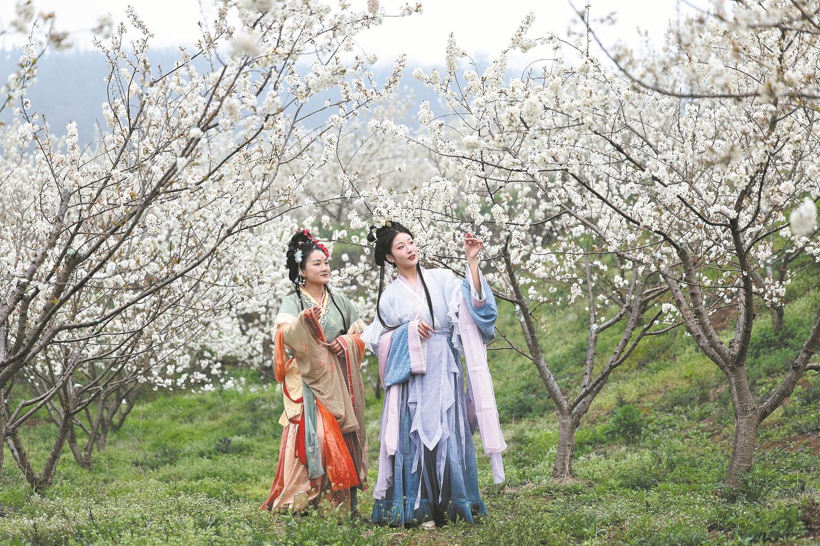 3月14日,身穿汉服的游客在襄城区隆中街道办事处陈家寨樱桃沟内游玩赏花。