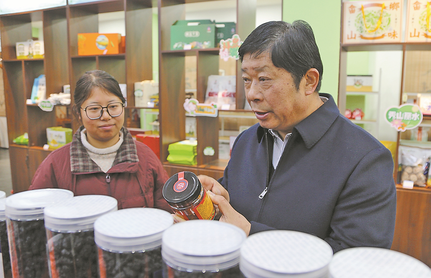 闵洪艳(右)关心“共富超市”营业情况。记者 童光辉 摄