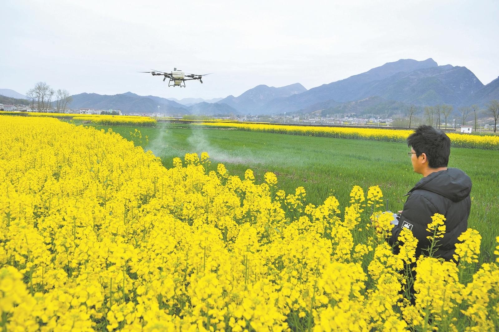 3月18日,在保康县马良镇潮水村,农技人员操作植保无人机对小麦开展飞防作业。