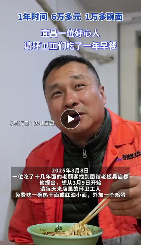 去年3月8日,一位吃了十几年面的老顾客找到吴启春。他提出,想从3月9日开始,请每天来店里的环卫工人免费吃一碗热干面或红油小面,外加一个鸡蛋。