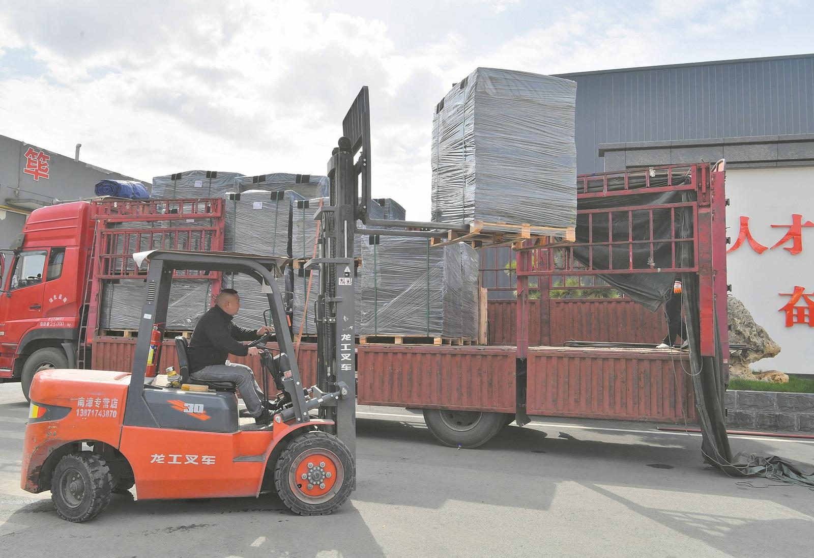 3月19日,在位于南漳县的湖北南泽汽车复合材料有限公司,工人忙着装运打包整齐的产品,确保及时交付。