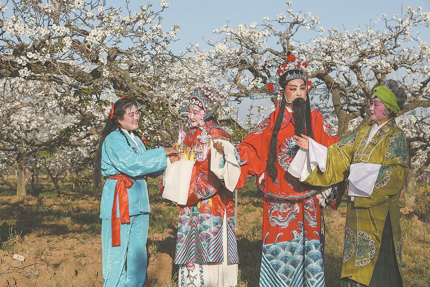 3月28日,戏曲工作者走进枣阳市太平镇张柏岗村百亩梨园为游客演唱传统戏曲《梨园春》。近日,张柏岗村百亩梨花迎来最佳观赏期,八方游客慕名而来。