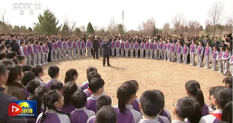 3月30日,党和国家领导人习近平、李强、赵乐际、王沪宁、蔡奇、丁薛祥、李希等来到北京市昌平区百善镇参加首都义务植树活动。这是习近平同在场的干部群众、少先队员亲切交谈。
