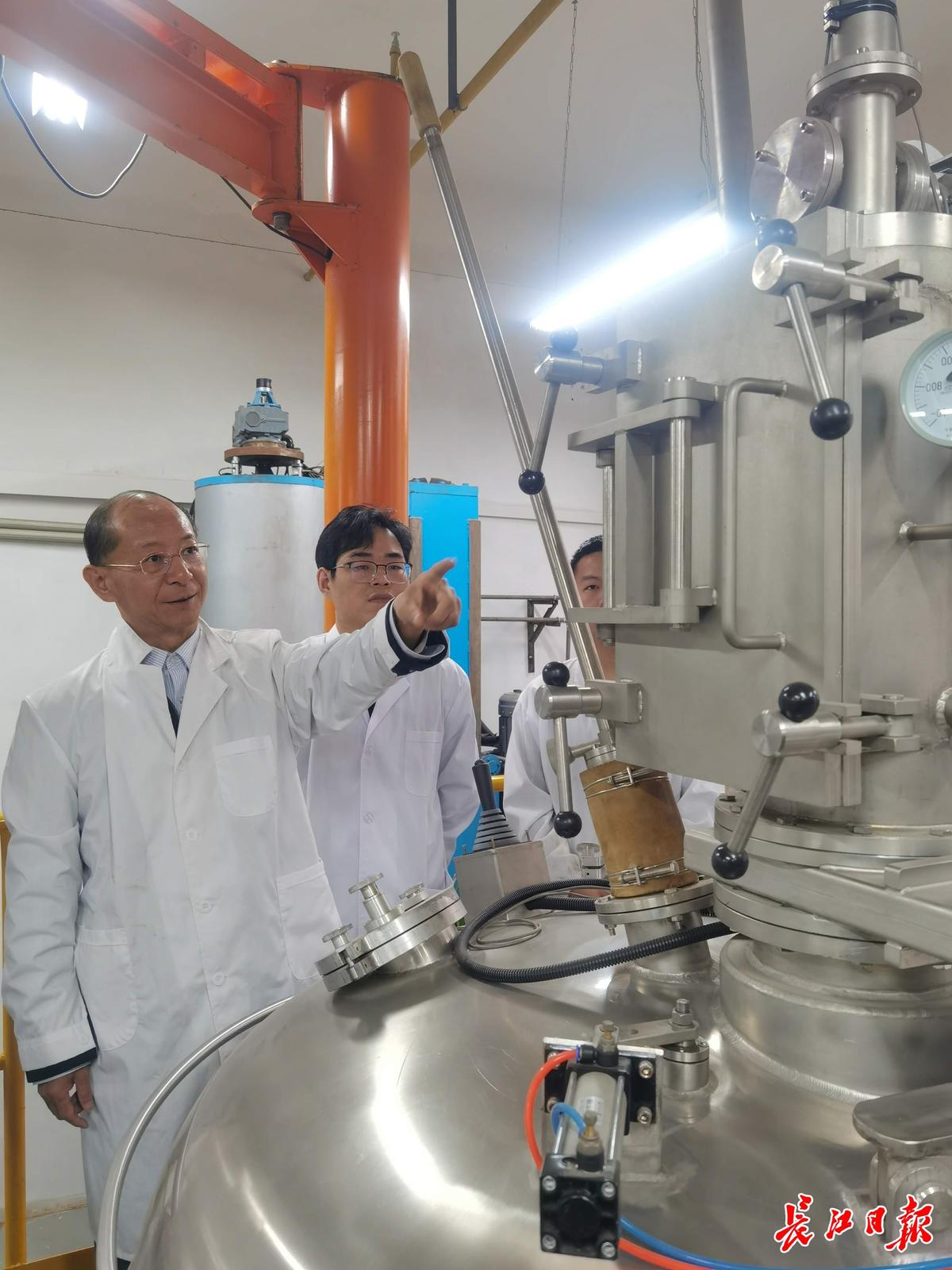 吴开明教授(左一)在实验室炼钢炉前检查设备。记者杨佳峰 摄