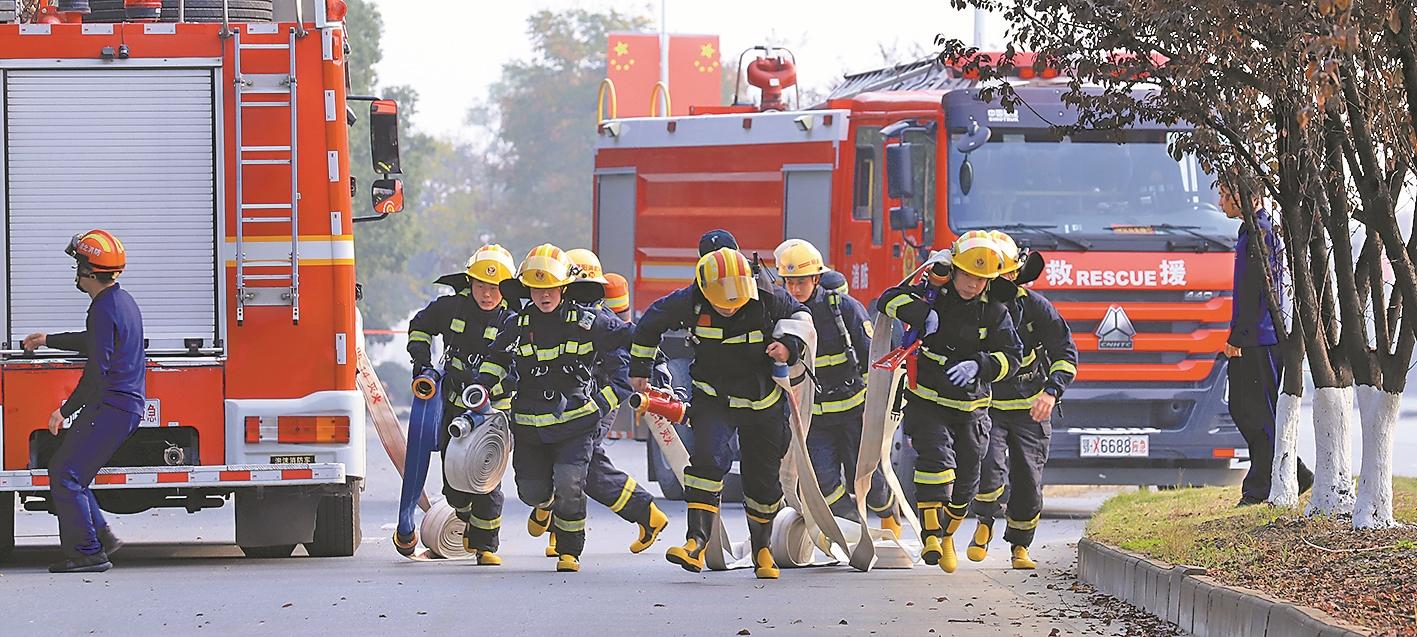 图为“枪炮协同作战操”科目现场,消防队员们快速铺设水带、精准协同配合,模拟对野外火场实施高效压制。 记者 姜雁冰 通讯员 王旭寅 摄