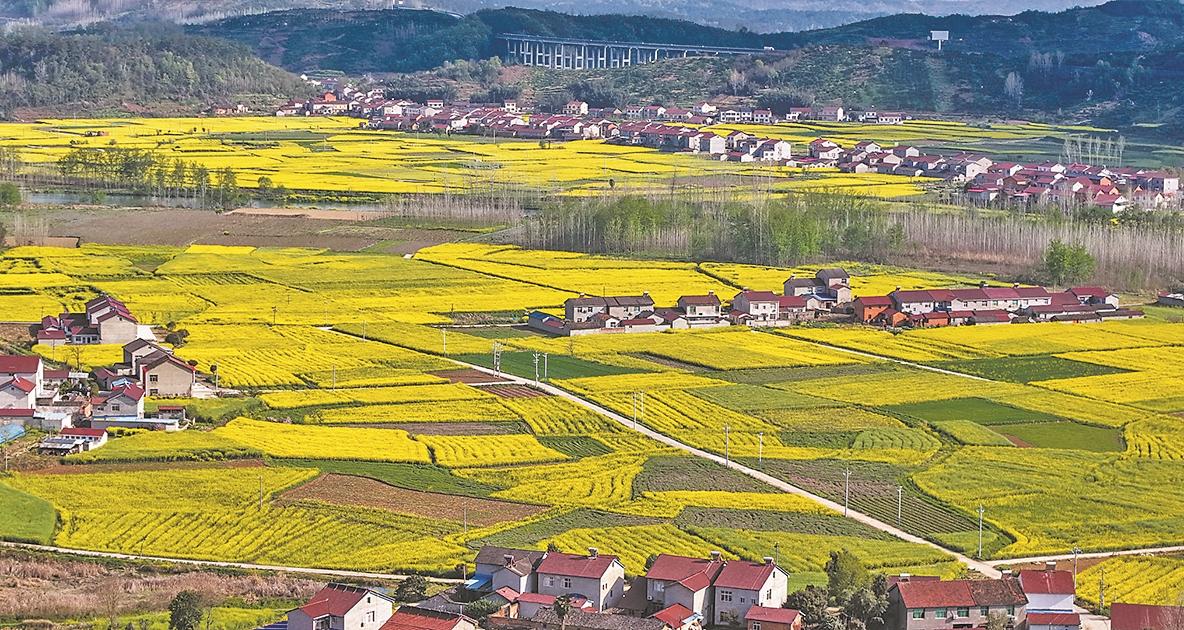 3月31日,南漳县巡检镇油菜花竞相盛开,白墙黛瓦的村落、云雾缭绕的远山与金黄的花海构成一幅美丽的田园画卷,吸引众多游客前来观赏。