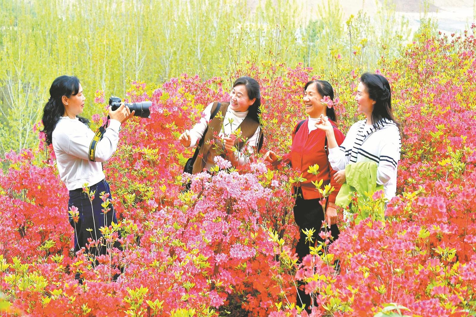4月7日,南漳县肖堰镇荆山杜鹃园内春色满园,吸引了不少游客前来踏青赏花。据了解,该杜鹃园占地300多亩。连日来,园内各色杜鹃花次第绽放,红色、粉色、紫色、白色和黄色的花朵“粉墨登场”,各展风姿。