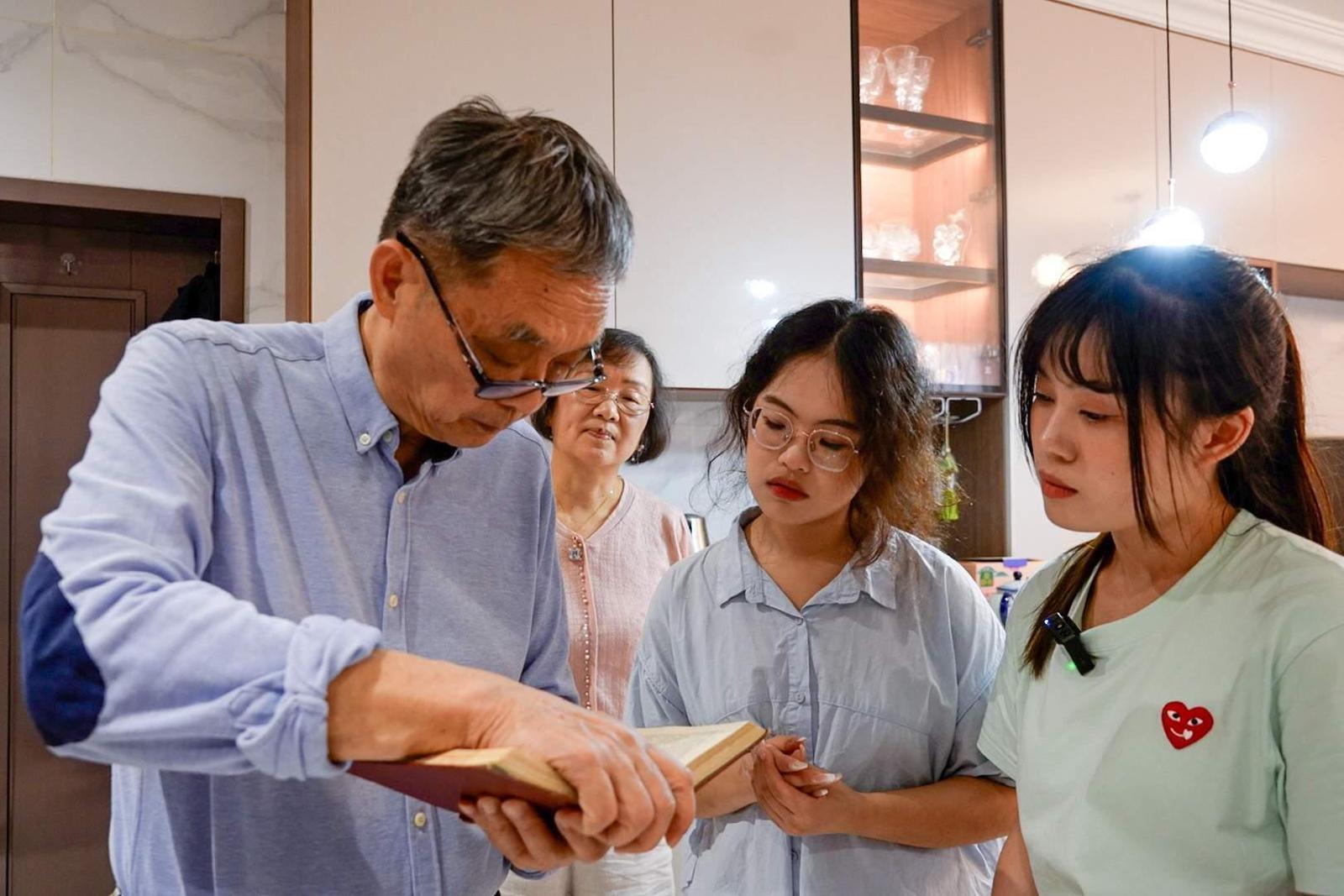 谈话间,吴杰明的夫人尹燕妮从书房捧出一大摞稿纸。纸张已泛黄发脆,边缘微微卷起,上面的字迹工整清晰。两名女大学生屏住呼吸,轻轻翻阅。