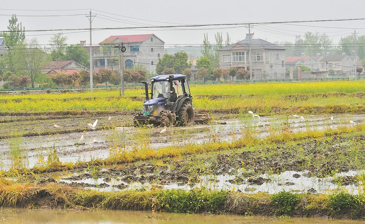 4月11日,在南漳县九集镇泉水堰村,拖拉机往来翻耕农田,白鹭翩跹而至,农人、农机与白鹭相映成趣,勾勒出一幅生机盎然的春日生态图景。