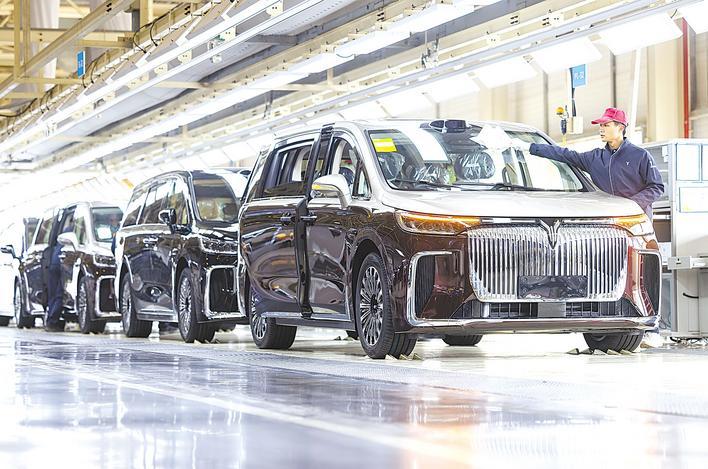 岚图汽车总装车间内,工人在流水线上作业,一辆辆新能源汽车驶下生产线。(湖北日报全媒记者 薛婷 摄)
