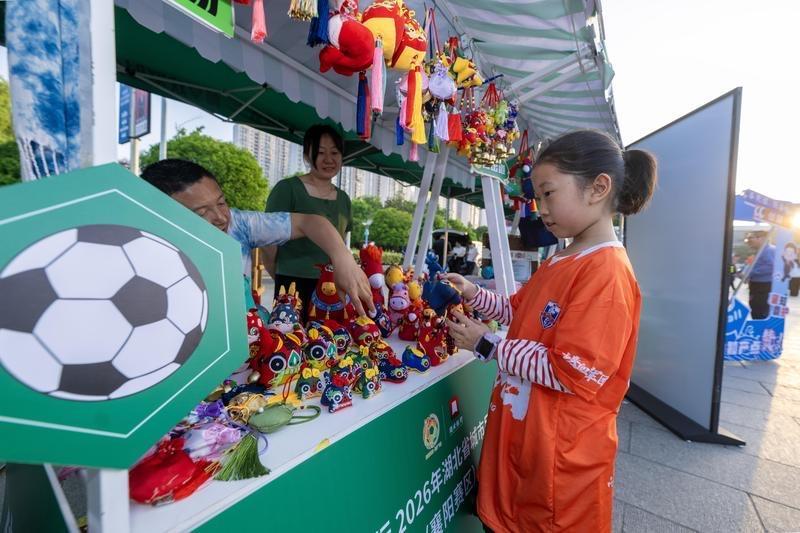 4月18日晚,楚超襄阳赛区首战在襄阳市体育中心打响。图为小球迷在楚超美食市集选购非遗枣阳粗布纺织商品。记者 江旭东 摄