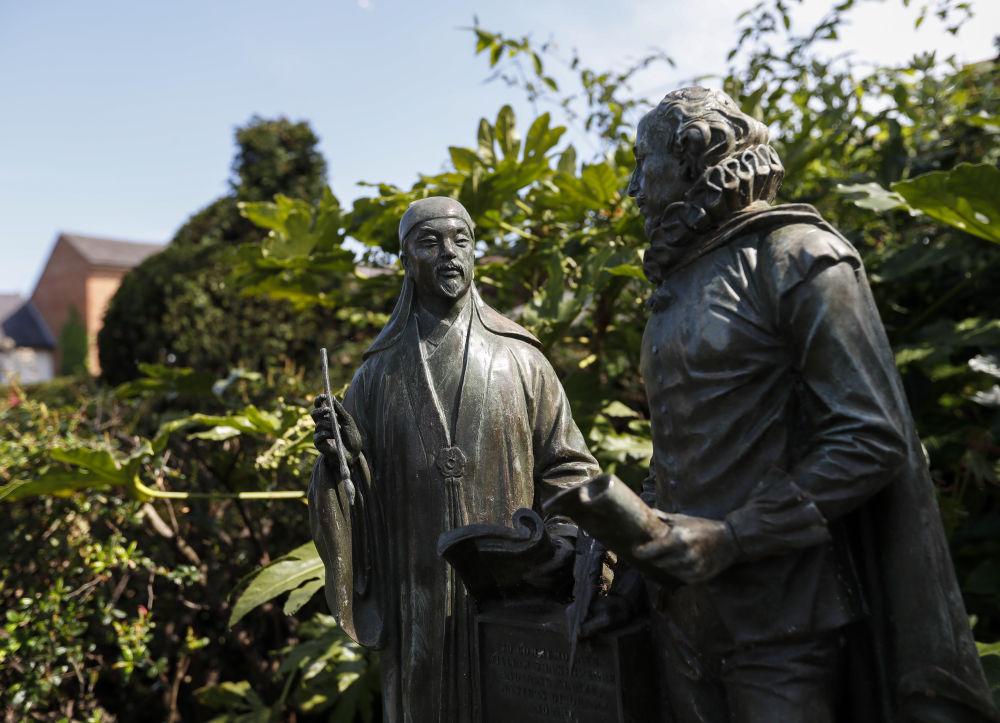 2022年4月20日在英国斯特拉特福拍摄的莎士比亚和汤显祖的青铜塑像。新华社记者 韩岩 摄