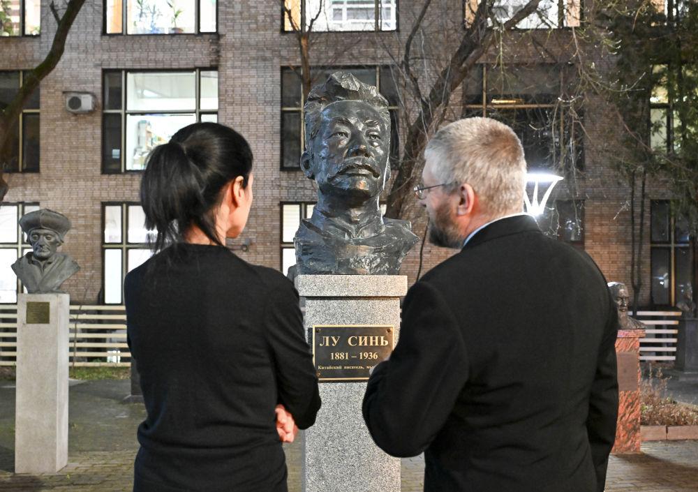 2025年12月5日,在俄罗斯首都莫斯科全俄外国文学国家图书馆,人们驻足观看鲁迅铜像。新华社记者 郝建伟 摄